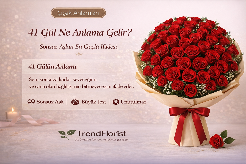 En net yorum: 41 kırmızı gül; sonsuz aşkı, kalıcı bağlılığı ve unutulmayacak kadar güçlü bir romantik jesti simgeler.