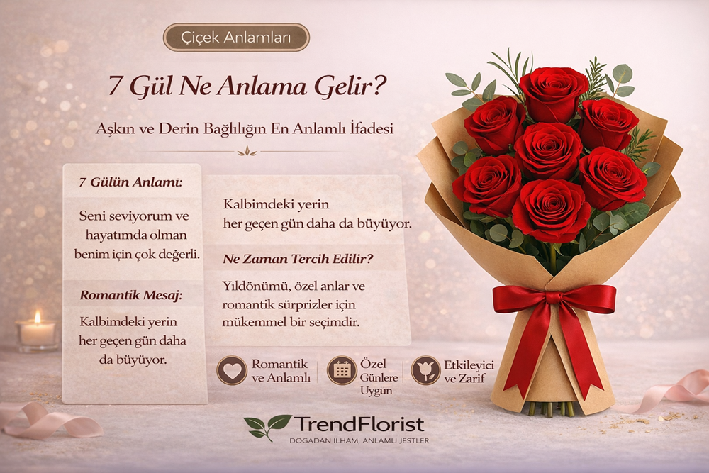 Kısacası 7 gül; “seni önemsiyorum”, “duygularım gerçek” ve “sen benim için özelsin” anlamına gelen dengeli bir seçimdir. Bu yüzden hem yeni başlayan ilişkilerde hem de uzun süredir devam eden ilişkilerde rahatlıkla tercih edilir.