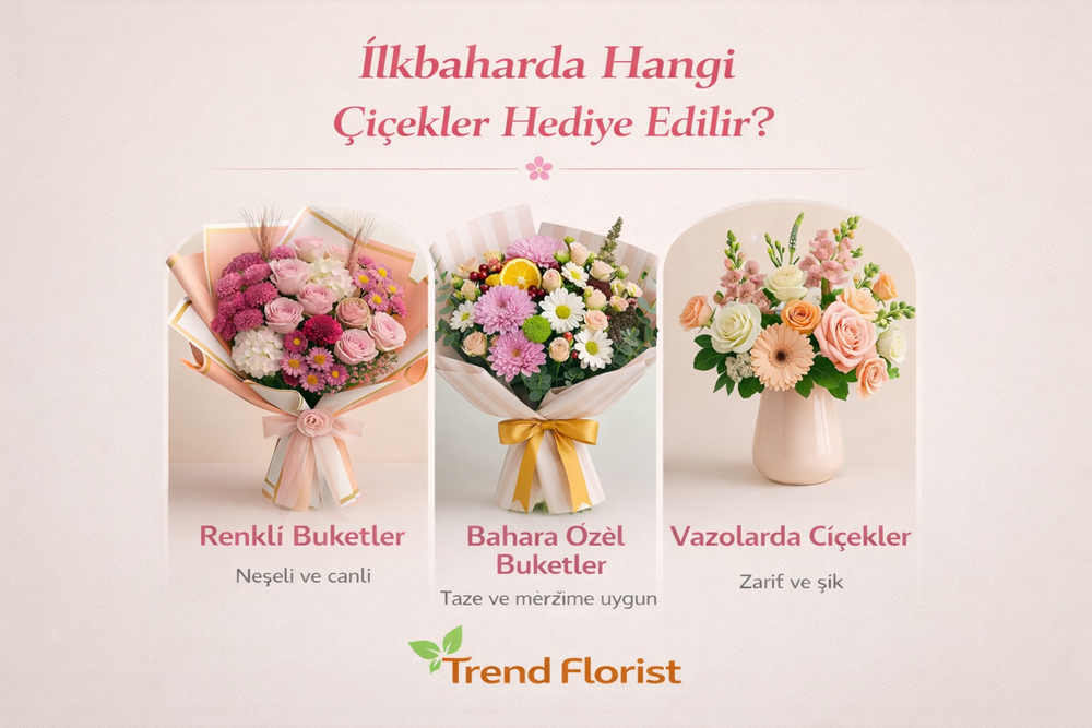 İlkbaharda lale, papatya, gerbera ve ferah karışık buketler en çok tercih edilen seçenekler arasındadır. Bu çiçekler mevsimin canlı ruhunu güçlü biçimde taşır.