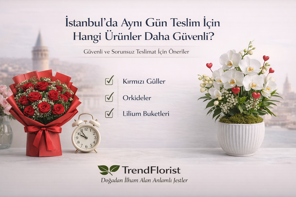 İstanbul’da aynı gün teslim için daha güvenli ürünler genellikle buketler, orkideler ve standart akışa uygun dengeli tasarımlardır. Çünkü bu ürünler hazırlanma, paketleme ve teslimat tarafında daha net bir yol sunar.