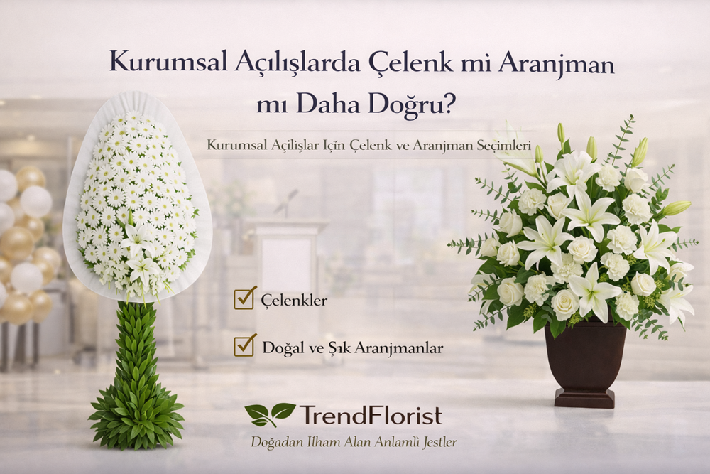 Kurumsal açılışlarda çelenk mi aranjman mı daha doğru sorusunun tek ve sabit bir cevabı yoktur. Dış mekânda görünürlük, resmiyet ve klasik kurumsal tebrik hedefleniyorsa çelenk çoğu zaman öne çıkar. İç mekânda premium, rafine ve dekoratif etki isteniyorsa aranjman daha güçlü çalışır.