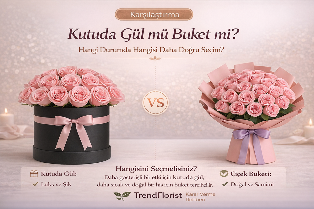 En pratik kural: Şıklık ve premium görünüm için kutuda gül, doğal ve duygusal etki için buket daha güçlü çalışır.
