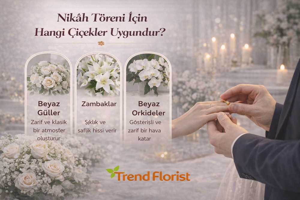 Nikâh töreni için en doğru çiçekler; sade, zarif, hafif ama etkili duran türler ve tasarımlardır. Beyaz, krem ve soft tonlar çoğu durumda en güvenli yaklaşımı sunar. Daha güçlü ve rafine bir görünüm isteniyorsa premium tasarımlar çok doğru bir tercih olabilir. Lilyum gibi asil türler de nikâh estetiğiyle güçlü biçimde örtüşebilir.