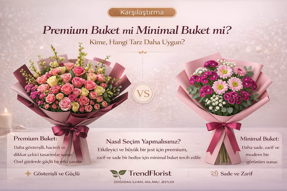En pratik kural: Büyük etki ve gösterişli sunum için premium buket, sade şıklık ve modern zarafet için minimal buket daha güçlü çalışır.