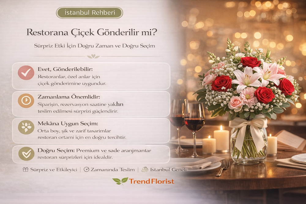 Restorana çiçek gönderilir mi sorusunun kısa cevabı evettir. Ancak en iyi sonuç; şık ama kontrollü ürün seçimi, net rezervasyon bilgisi, doğru saat planlaması ve ortam uyumuna dikkat edildiğinde alınır. Özellikle premium ama dengeli tasarımlar, restoran sürprizlerinde en güçlü seçenekler arasında yer alır.
