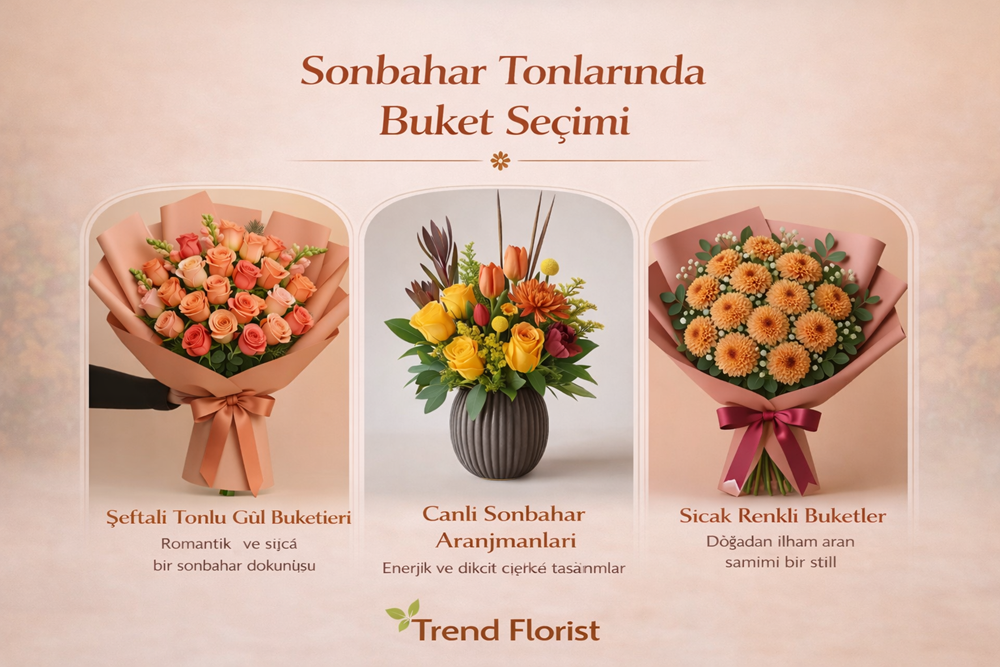 Sonbahar tonlarında doğru buket seçimi; mevsimin sıcak ve olgun ruhunu taşıyan, renk geçişlerini dengeli kullanan ve sunum dili güçlü olan tasarımlarla yapılır. Daha seçkin ve karakterli bir sonuç arıyorsanız premium tasarımlar bu mevsimde çok güçlü çalışır. Daha sade ve güvenli bir karşılaştırma yapmak için premium ve klasik buket farkı içeriği de yol gösterici olur.