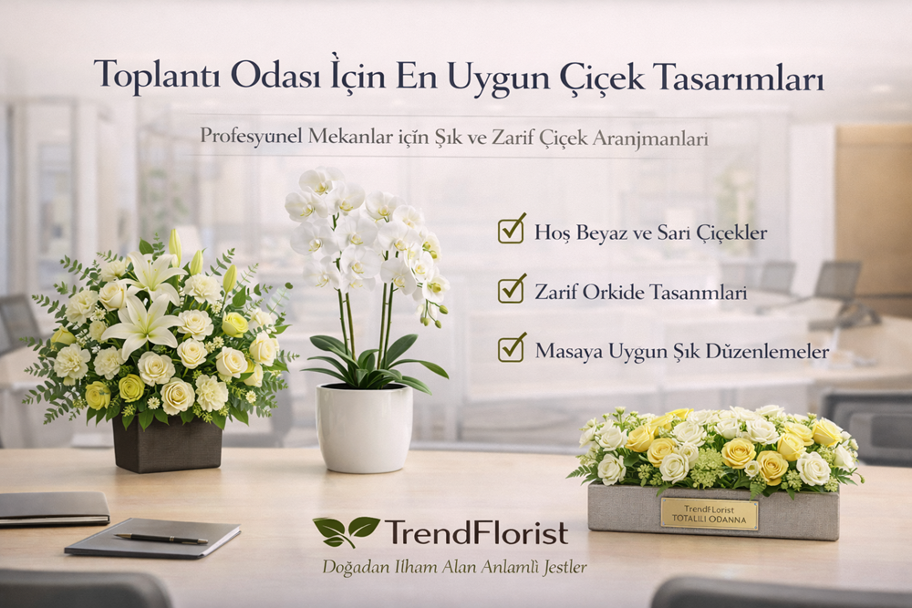 Toplantı odası için en uygun çiçek tasarımları; açık tonlu, sakin, masa dostu ve profesyonel ortama uyumlu tasarımlardır. Bu yüzden alçak aranjmanlar, zarif orkideler ve kurumsal premium ürünler çoğu senaryoda en doğru seçenekler arasında yer alır.