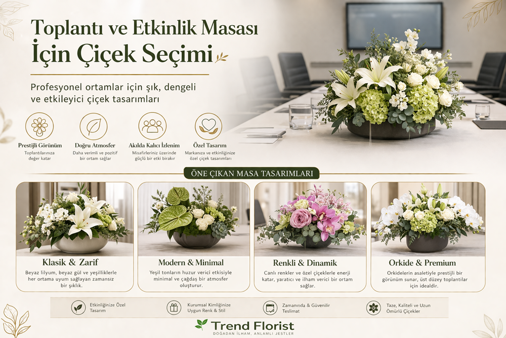 Toplantı ve etkinlik masası için doğru çiçek; masa kullanımıyla uyumlu, profesyonel, fotoğrafta temiz görünen ve genel mekan kalitesini yükselten çiçektir. Daha yüksek algılı ve stilize bir sonuç için premium tasarımlar, daha dengeli ve iş ortamına uyumlu bir çözüm için ise kurumsal çiçekler güçlü seçenekler sunar.