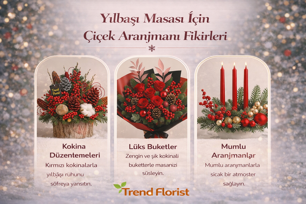 Yılbaşı masası için çiçek aranjmanı fikirlerini; premium tasarımlar, yeni yıl renkleri, masa düzeni ve şık sunum önerileriyle keşfedin.