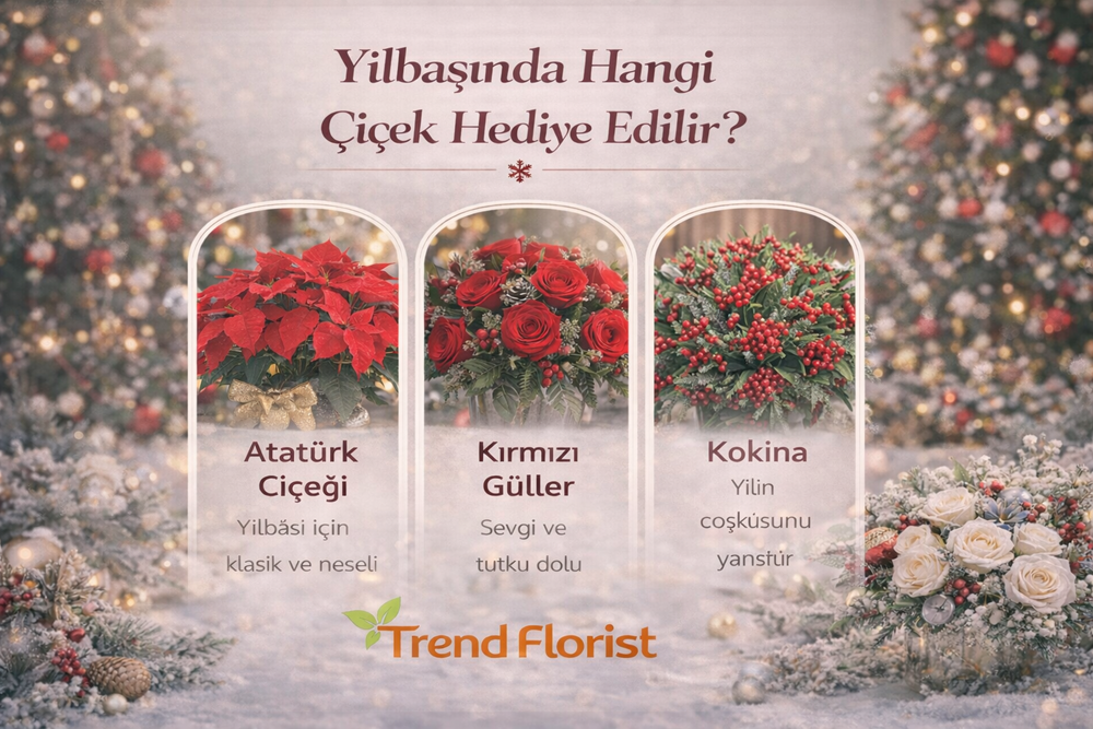TrendFlorist çizgisinde yılbaşı için hazırlanan tasarımlarda amaç yalnızca kırmızı-yeşil tonlar kullanmak değil; aynı zamanda yeni yıl atmosferini estetik biçimde taşıyan, şık görünen ve hediye etkisi yüksek kompozisyonlar oluşturmaktır. Bu yüzden özellikle kokina ve yeni yıl koleksiyonu bu dönemde çok güçlü bir başlangıç noktasıdır.