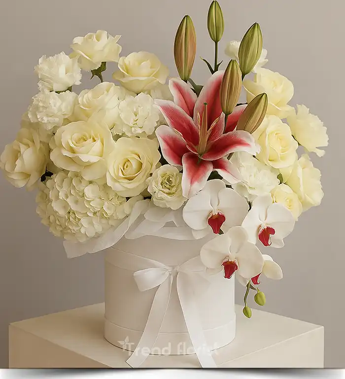 Elite White Box – Beyaz Orkide, Gül ve Lilyum Aranjmanı