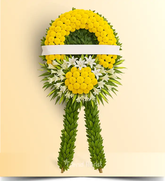Sarı Ginya & Beyaz Lilyumlu Cenaze Çelengi – Kurdele Alanlı Halkalı Tasarım | Trend Florist®