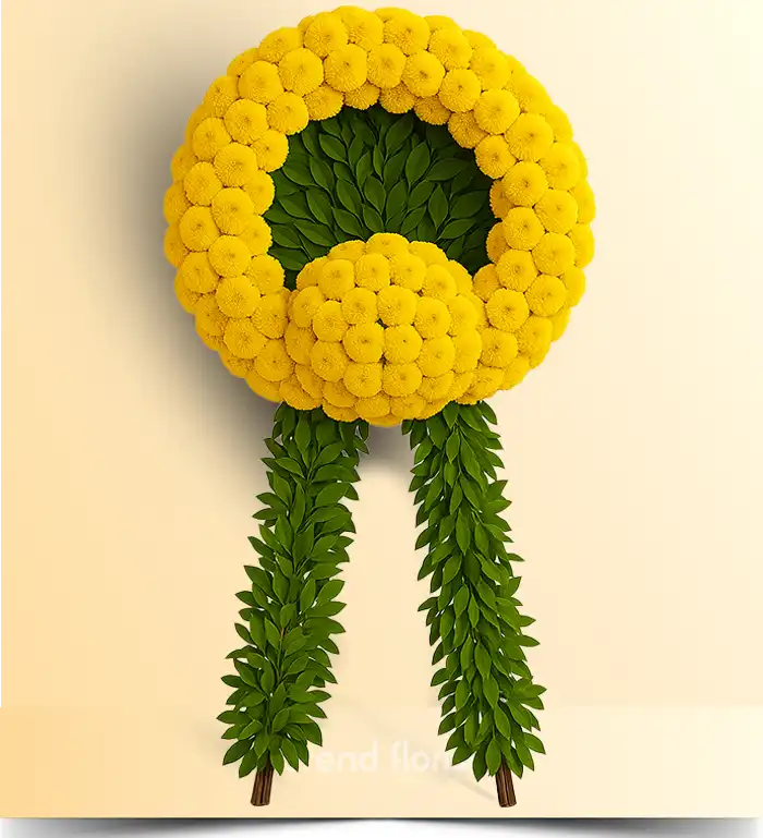 Sarı Ginyalı Cenaze Çelengi – Klasik Halkalı Form, Defne Yapraklı Ayak | Trend Florist®