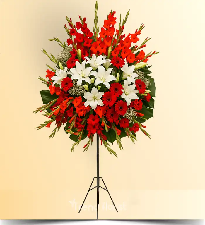 Kırmızı Beyaz Lilyumlu Gerbera Çelenk | Trend Florist® İstanbul – Düğün & Açılış Çiçeği