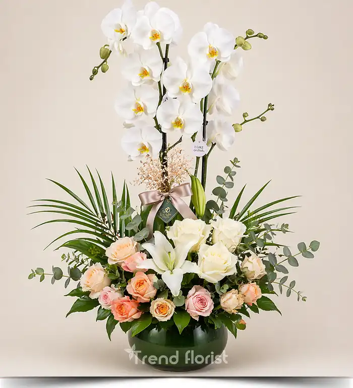 Beyaz orkidenin zamansız ve zarif duruşunu, lilyum ve soft tonlu güllerle bir araya getiren bu özel tasarım; sade lüks anlayışını güçlü bir aranjman formunda sunar. Dikey yükselen orkide yapısı ile alt bölümdeki dolgun çiçek kompozisyonu dengeli bir görünüm oluşturur.