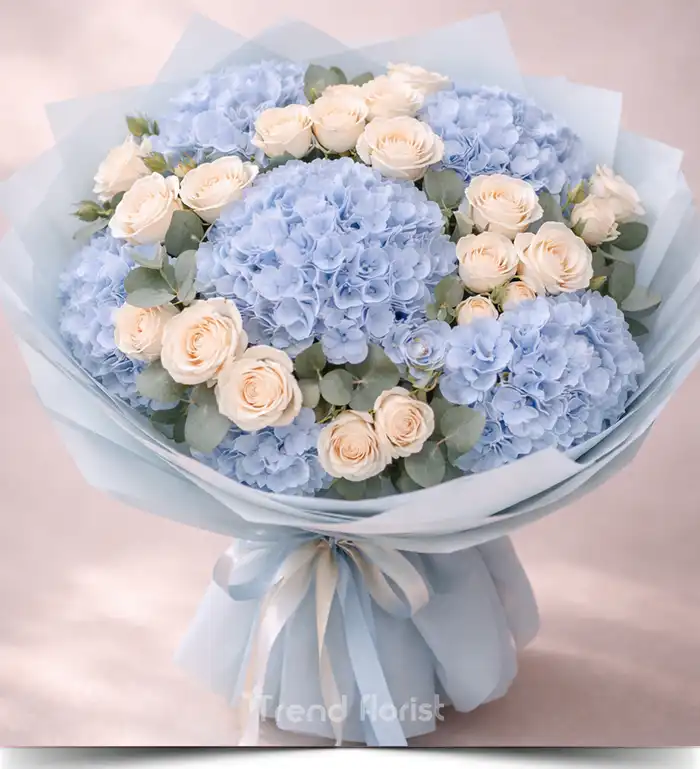 TrendFlorist® Azurea Mavi Ortanca & Krem Gül İsteme Buketi, mavi ortancanın hacimli ve dikkat çekici yapısını krem güllerin zarif dokusuyla birleştiren modern bir isteme tasarımıdır. Farklı renk paleti sayesinde klasik buketlerden net şekilde ayrışır.