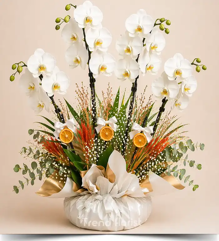 Beyaz 4 Dallı Orkide – Kuru Çiçek Tasarımlı