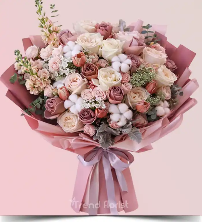 TrendFlorist® Bianca Cotton Rose Kız İsteme Buketi, pamuk dokusunu soft gül tonları ve romantik eşlikçi çiçeklerle bir araya getiren butik bir isteme tasarımıdır. Pudra, ekru ve sıcak gül tonlarının dengeli birlikteliği sayesinde hem zarif hem de özel bir görünüm sunar.