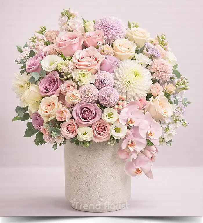 Blush Royale; pudra pembe, lila ve krem tonların zengin geçişleriyle hazırlanmış, yüksek hacimli deluxe premium bir çiçek aranjmanıdır.