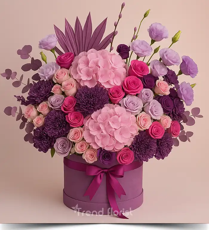 TrendFlorist® Mor Romantik Lüks Tasarım, kutuda çiçek koleksiyonumuzun en gösterişli ve zarif tasarımlarındandır. Lila, mor ve pembe tonlarda hazırlanmış bu özel kutu, duygusal ifadeyi şıklıkla birleştirir. Özenle seçilmiş güller, ortancalar ve krizantemlerle hacimli, zarif bir form elde edilmiştir.