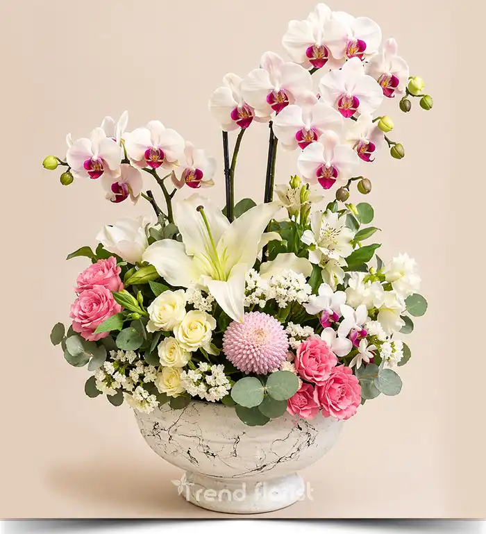 Beyaz ve pembe tonların zarif uyumunu yansıtan bu özel tasarım, orkide, lilyum ve güllerin dengeli birleşimiyle hazırlanmıştır. Renk geçişleri sayesinde hem ferah hem de romantik bir görünüm sunan bu aranjman, yumuşak ve huzurlu bir etki oluşturur.