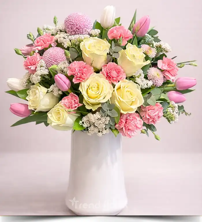 Bu aranjmanda renk geçişi sert kontrastlar yerine yumuşak geçişlerle kurulmuştur. Krem güllerin sakinliği, pembe lale ve karanfillerin canlılığıyla dengelenir. Böylece ürün hem romantik hem de rafine bir siluet sunar.