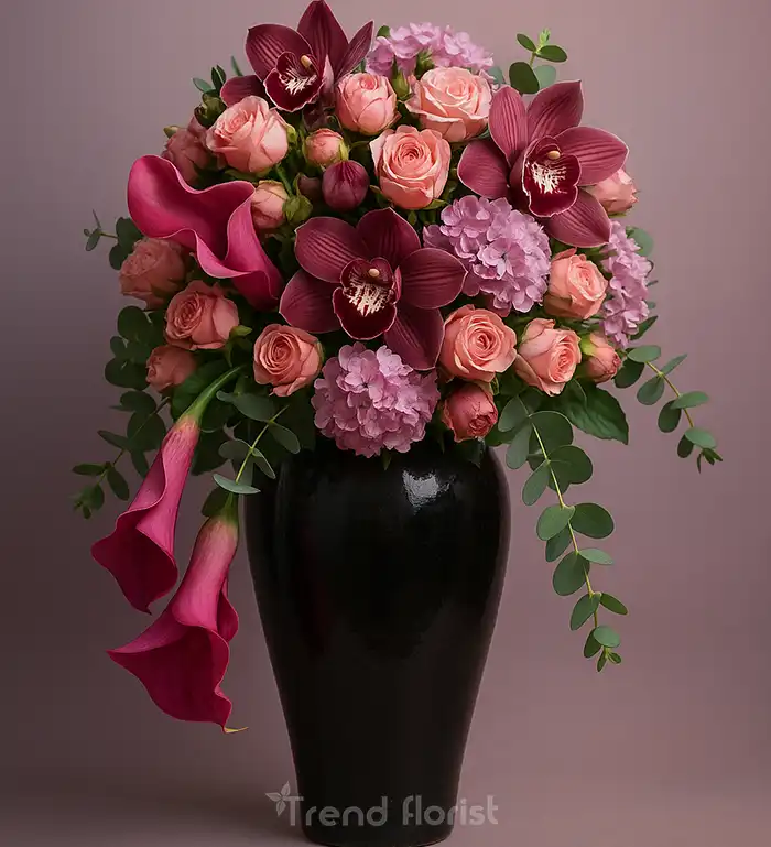 Premium Bordo Orkide & Şeftali Gül Aranjmanı – Deluxe Vazo Tasarımı
