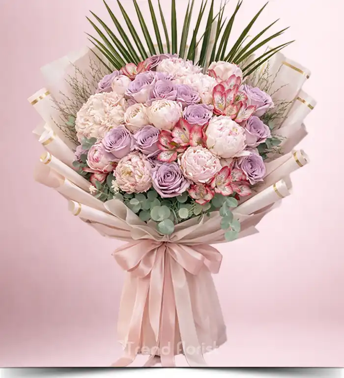 TrendFlorist® Şakayık Kız İsteme Buketi Tasarımı, pastel tonların zarafetini dolgun ve gösterişli bir buket formuyla bir araya getiren özel bir isteme çiçeğidir. Lila tonlu güller, açık pembe büyük formlu çiçekler, uyumlu eşlikçi detaylar ve soft pembe ambalaj bir araya gelerek hem romantik hem de seçkin bir sunum oluşturur.