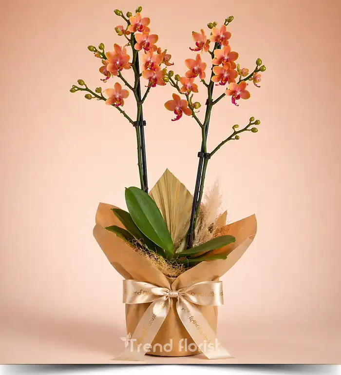 Somon tonlarının sıcak ve modern etkisini taşıyan bu midi orkide tasarımı, iki dallı yapısı, doğal kuru dokularla zenginleştirilmiş sunumu ve TrendFlorist premium paketleme anlayışıyla hazırlanır. Gösterişli olmadan dikkat çeken bu özel tasarım; doğum günü, teşekkür, yeni iş tebriği, ofise çiçek gönderimi ve zarif kurumsal hediyeler için güçlü bir alternatiftir.